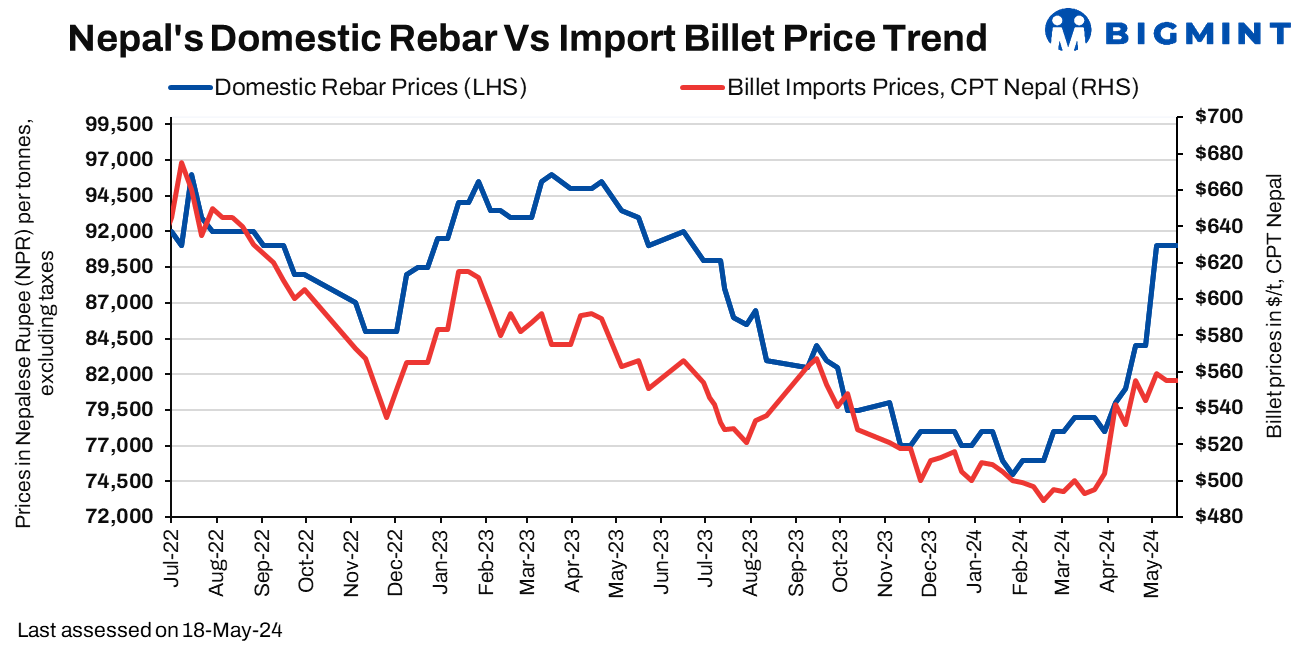 Nepalese rebar offers (cash guarantee) fell by NPR 1,000/t ($7/t) w-o-w to NPR 91,000-92,000/t ($682-690/t) exw, against NPR 91,000-93,000/t ($682-697/t) a week ago. Meanwhile, offers of bank guarantee remained range-bound at NPR 94,000-95,000/t ($705-712/t) exw. Deals have been heard concluded at lower offers, sources informed BigMint. Moreover, declining raw material prices also put pressure on offers.