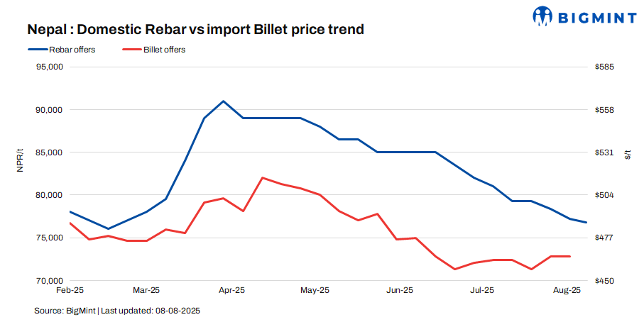 Nepal’s rebar offers fell by NPR 400/t ($3/t) w-o-w to NPR 76,500-77,500/t ($545-552/t) for cash guarantee and NPR 78,500-79,500/t ($560-567/t) for bank guarantee sales amid weak demand in monsoon season. Wire rod (IF-EAF) offers dropped $5/t w-o-w to $498/t CNF Raxaul. Around 1,000 t of wire rods were booked at $490-495/t CNF Raxaul this week.