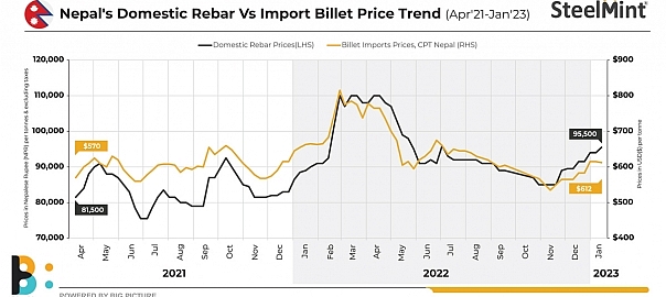 - Import prices up in recent bookings from India: Imported steel prices from India inched up in recent deals. Current offers of IF-route billets from India stand at $605-610/t CPT Nepal and BF-route billet offers stand at $590/t ex-mill (equivalent to $610/t CPT Nepal). A deal for 7,000 t of Indian-origin BF-route billets was concluded last week at $600/t CPT Nepal.