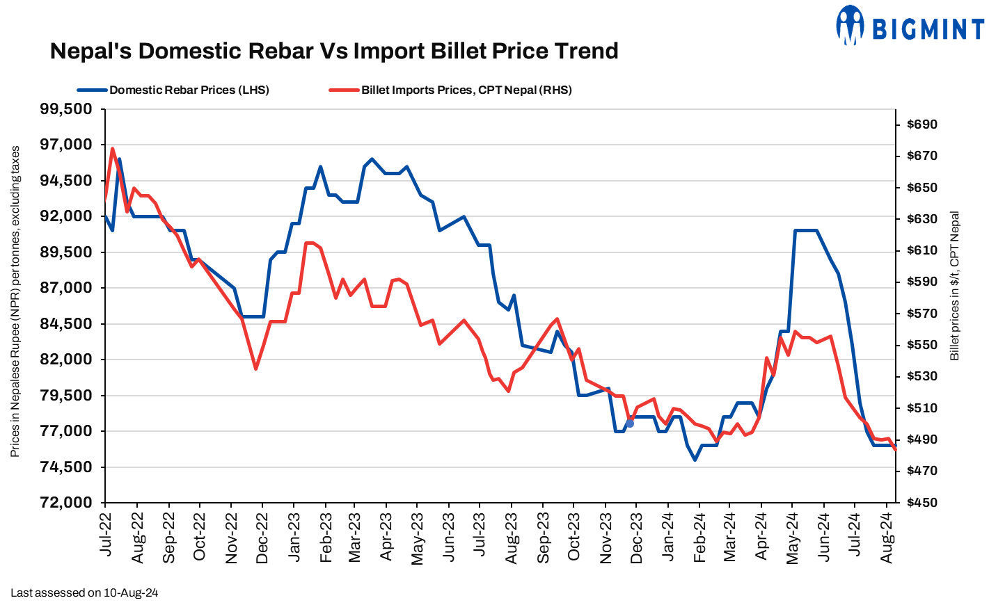 Nepalese rebar offers remained flat for the week for both cash and bank guarantee, with offers ranging between NPR 76,000-77,000 ($565-573/t) and 78,000-80,000/t ($580-595/t), respectively. The trade activities remain low due to the ongoing monsoon. BF-route wire rod coil (WRC) offers increased by $5-10/t w-o-w to $560-565/t exw. However, EAF/IF-origin WRC offers decreased by $5/t w-o-w to $500-505/t exw, Durgapur.