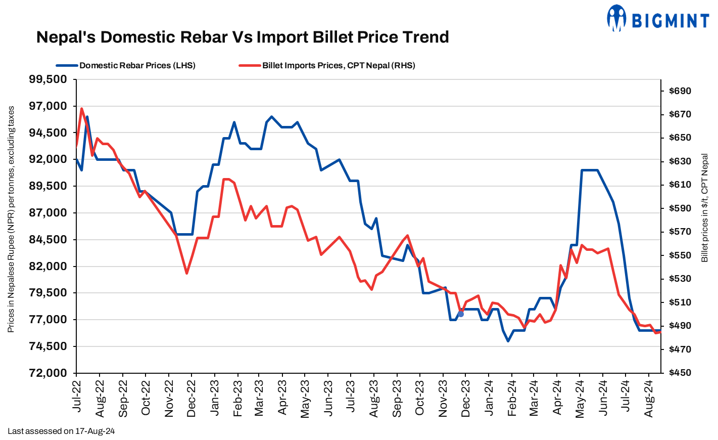 Nepal’s rebar offers remained range-bound for the week amid low domestic demand. The offers for both cash and bank guarantee are hovering around 76,000-77,000 ($566-574/t) and 78,000-80,000/t ($581-596/t), respectively. Wire rod coil (WRC) offers for both BF-route and IF/EAF route remained stable w-o-w. Bf route offers stood at $560-565/t exw and and IF/EAF route offers ranging at $500-505/t exw, Durgapur.