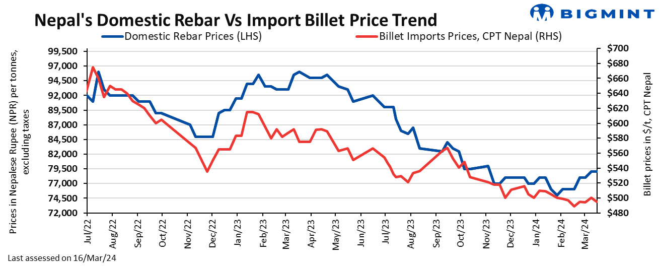 - Nepal’s finished long steel imports for February 2024 increased by 2,562 t or 21% m-o-m to 14,804 t against 12,242 in January 2024.