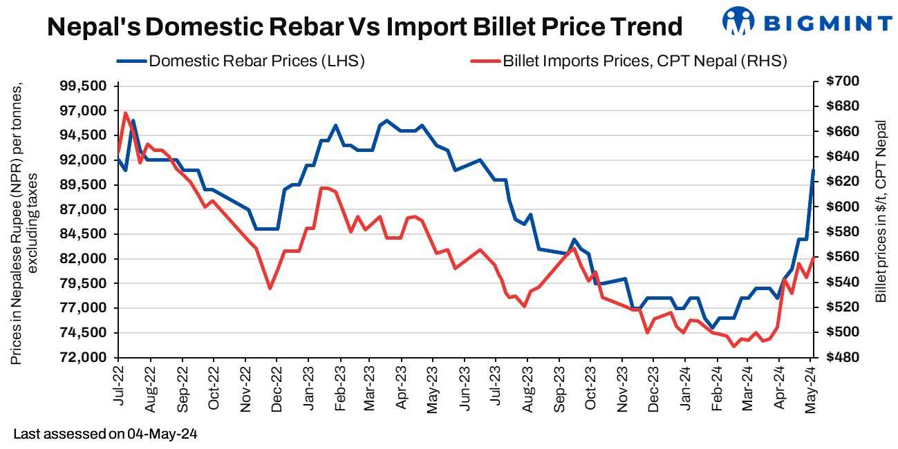 Nepal’s rebar offers for cash and bank guarantee rose by NPR 7,000-8,000/t ($52-60/t) w-o-w to NPR 91,000-93,000/t ($682-697/t) and NPR 94,000-95,000/t ($704-712/t) exw against 84,000-85,000/t ($629-637/t) and NPR 87,000-88,000/t ($652-659/t) a week ago, despite low domestic demand as the rise in raw materials costs and load shedding have pushed rebar prices higher. However, no deals have been heard concluded this week.