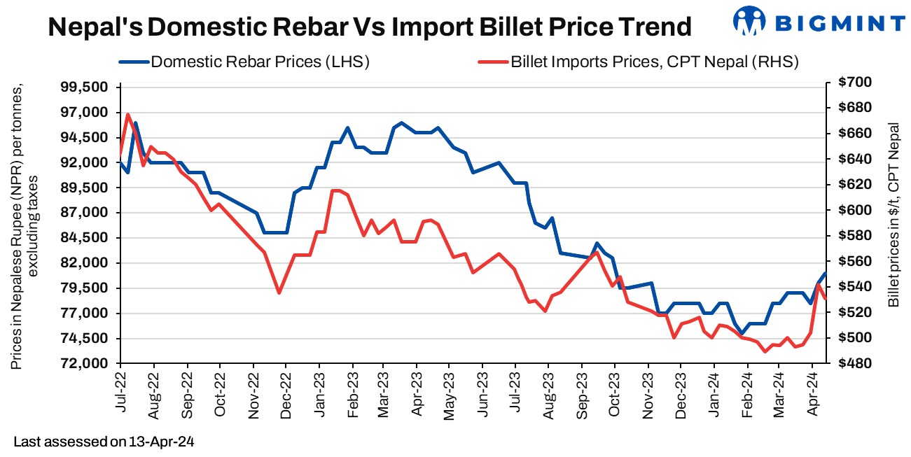 Nepalese rebar offer for buyers offering cash and bank guarantees (credit) rose by NPR 1,000/t ($7/t) w-o-w to NPR 81,000-82,000 /t ($605-613/t) and NPR 84,000-85,000/t ($628-635/t) exw, respectively, against NPR 80,000-81,000/t ($598-605/t) and NPR 82,000-84,000/t ($613-628/t) seen in the previous week. The increase in power outages, despite slow domestic demand, has lead to the hike in rebar prices.