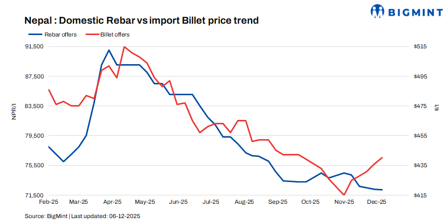 Nepal: Rebar prices decline by $7/t m-o-m in Nov’25