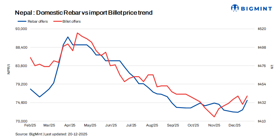 Nepal’s rebar prices rose NPR 2,400/t ($17/t) w-o-w to NPR 74,000-76,000/t ($516-530/t) for cash guarantee sales and NPR 76,000-78,000/t ($530-544/t) for bank guarantee transactions. Frequent power cuts led to concerns over potentially higher production costs, and buyers made purchases due to expectations of price hikes. However, demand has not recovered significantly. Meanwhile, wire rod (IF-EAF) offers were unchanged w-o-w at $461/t CNF Raxaul.