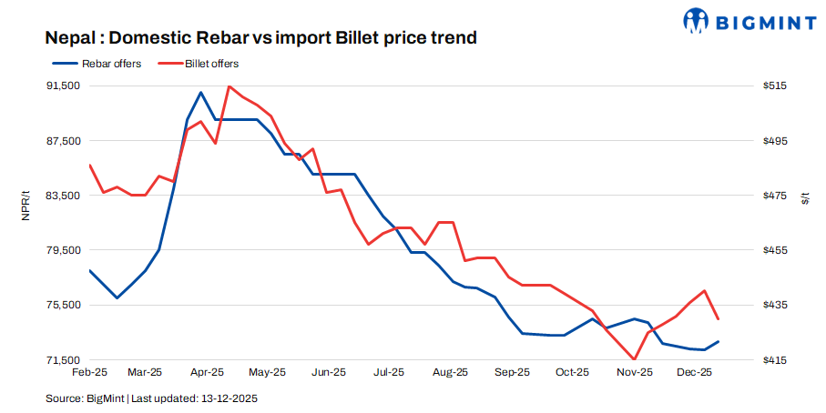 Nepal: Rebar prices rise by NPR 600/t ($7/t) w-o-w on producer-led hikes despite weak demand