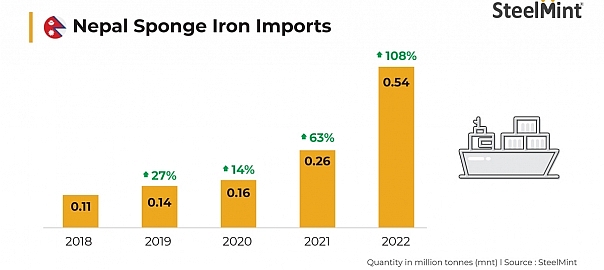 Nepal’s steel industry has been growing rapidly, driven by increased demand for construction, infrastructure development, and consumer goods. As a result, there has been a corresponding increase in the country’s melting capacities, leading to a rise in sponge iron imports. Data showed that its volumes have steadily risen from a mere 0.11 mnt in 2018 and spurted to 0.54 mnt in January-December 2022. Additionally, the import of billets, a key raw material for steel production, has been declining. Nepal’s imports of billets have plunged from over 1 mnt in 2021 to 0.46 mnt over January-December, 2022, fueling the increase in sponge iron imports.