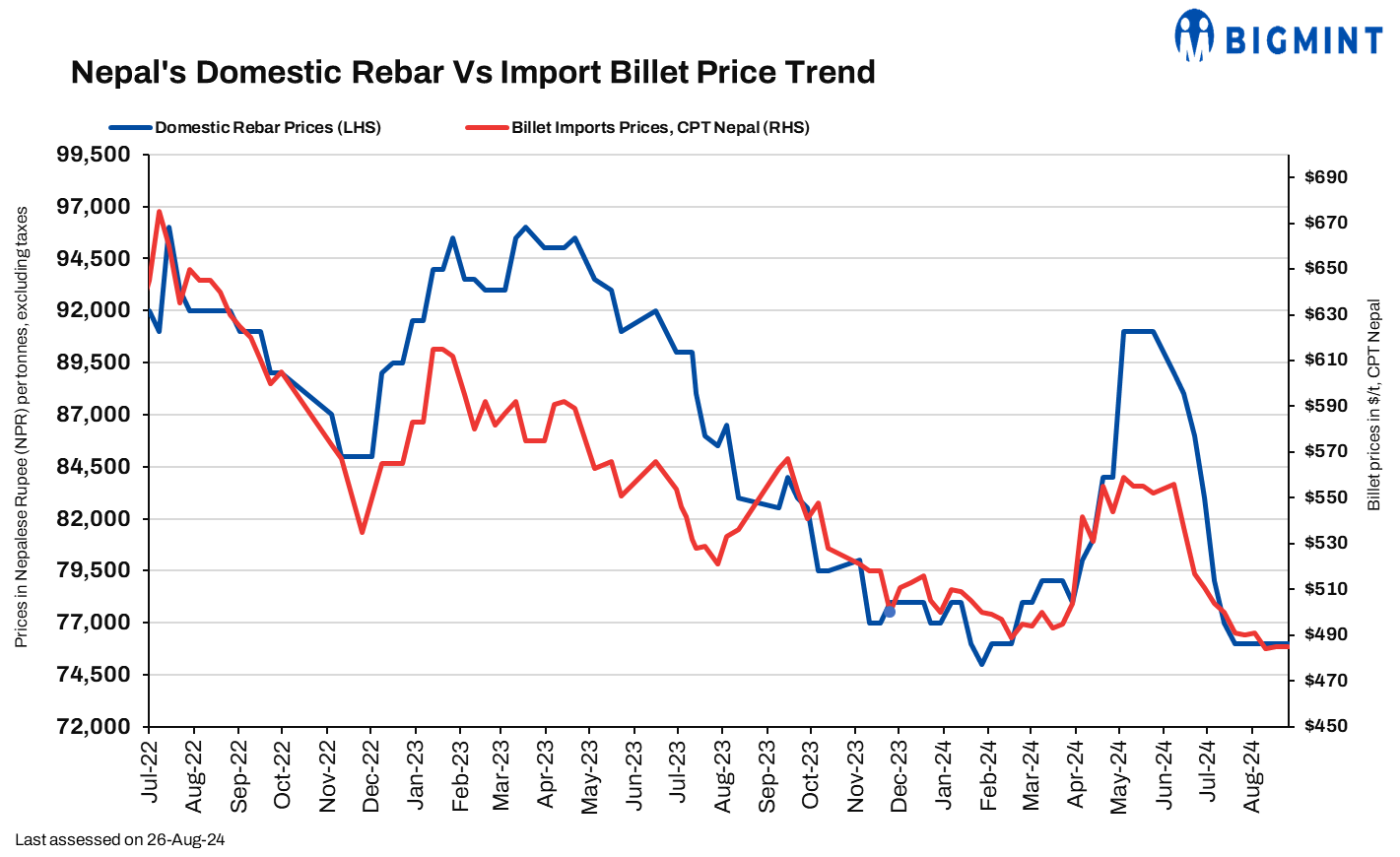 Nepalese rebar prices remained stable w-o-w as domestic demand continued to be slow. Rebar offers for both cash and bank guarantee payments were hovering around NPR 76,000-77,000/t ($566-574/t) and NPR 78,000 to 80,000/t ($581-596/t), respectively. WRC offers also remained unchanged w-o-w for both BF and IF/EAF route production. BF-route offers stood at $560-565/t exw. IF/EAF route offers were around $500-505/t exw Durgapur.