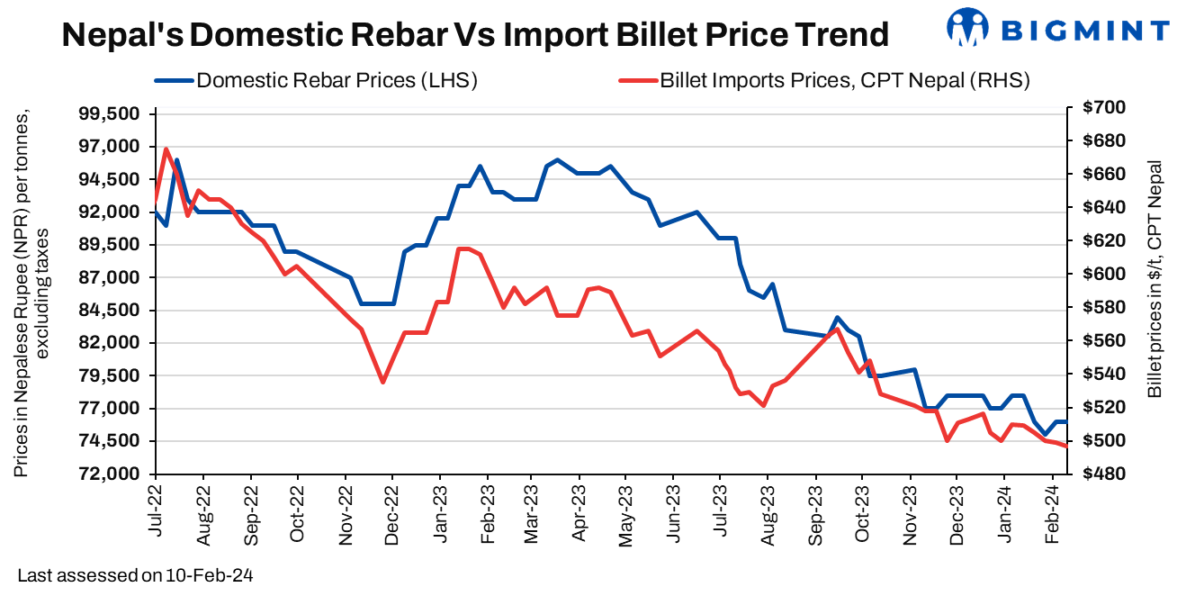 Rebar offers in Nepal remained flat at NPR 76,000-77,000/t ($572-579/t) and NPR 80,000-81,000/t ($602-610/t) ex-works for cash and bank guarantee, respectively. However, no deals have been heard. Wire rod coil (WRC) offers through the BF- and and EAF/IF-routes remained unchanged w-o-w at $560/t and $520-525 exw, respectively, as reported by players based in Durgapur. Trade activities remained sluggish amid subdued demand.