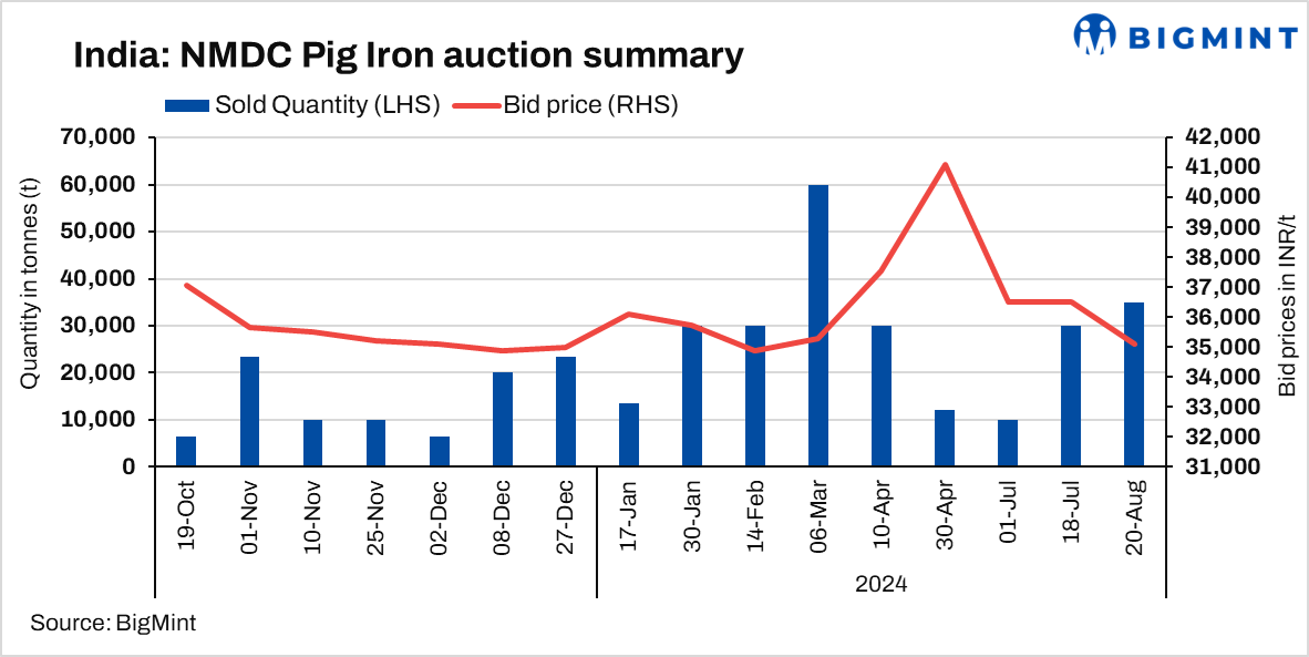 NMDC’s steel plant in Nagarnar, Chhattisgarh, conducted a steel-grade pig iron auction for a total of 35,000 t on 20 Aug’24. The whole quantity received bid at an average price of INR 35,100/t. Although, management approval is still pending. In the previous approved auction, held on 18 July’24, out of 40,000 t, the entire quantity had been booked at an average price of INR 36,500/t.