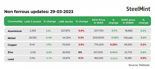 Non-ferrous metals prices on the London Metal Exchange (LME) increased on 28 March, 2023.