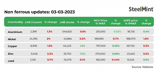 Non ferrous metals prices on all major exchanges remained negative in the last trading session on 2 March, 2023.