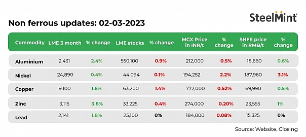 Non-ferrous metals prices on all major exchanges remained positive in the last trading session on 1 March, 2023.