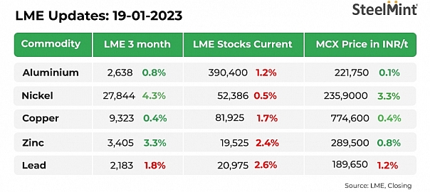 Three-month contract prices on the London Metal Exchange (LME) showed an uptrend. Aluminium prices increased by 0.8%, zinc up by 3.3%, lead decreased by 1.8%, copper up 0.4%, and nickel up by 4.3%.