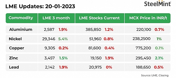 On Multi Commodity Exchange (MCX), futures prices showed a mixed trend. Nickel increased by 1% to INR 2,382/kg, copper remained firm, and zinc rose by 2.1% to INR 295/kg. However, lead decreased by 0.5% to INR 188/Kg and aluminium declined 0.7% to INR 220/kg.
