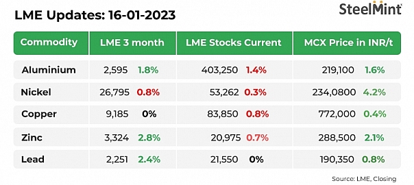 On the Multi Commodity Exchange (MCX), futures prices showed a mixed trend. Nickel increased by 4.2% to INR 2,340/kg, lead edged up by 0.8% to INR 188.9/kg, copper remained almost stable at INR 772/kg, aluminium edged up by 1.6% to INR 219/kg, and zinc rose 2.1% to INR 288/kg.