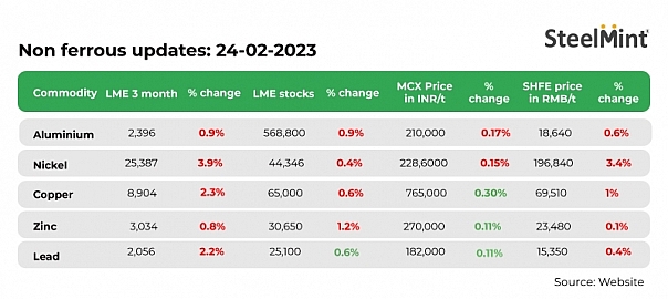 Non-ferrous metals prices on all major exchanges remained negative in the last trading session on 23 February, 2023. The US dollar, on the other hand, continued to remain high.