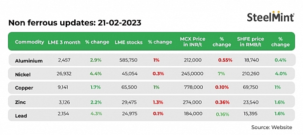 Non-ferrous metals prices on all major exchanges remained positive in the last trading session on 20 February, 2023. The US dollar, on the other hand, continued to remain high.