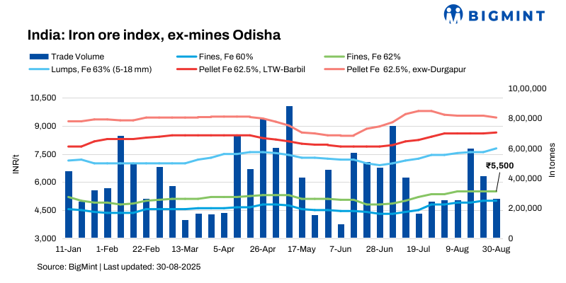BigMint’s Odisha iron ore fines (Fe 62%) index remained stable w-o-w at INR 5,500/tonne (t) ($62.5/t) ex-mines on 30 August 2025. Deals for around 260,000 t were recorded by BigMint in Odisha, with steelmakers procuring smaller volumes.