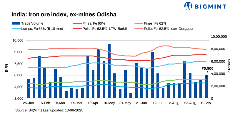 BigMint’s Odisha iron ore fines (Fe 62%) index remained stable w-o-w at INR 5,500/tonne (t) ($62.5/t) ex-mines on 13 September 2025. BigMint recorded deals for around 380,000 t in Odisha, concluded by direct sales. The market concluded Fe62% fines deals at the level of INR 5,500-5,600/t ex-mines this week, while some low-grade deals were also heard.