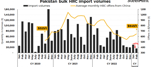 Pakistan’s bulk HRC import volumes in Feb’23 fell by 47% m-o-m to 15,882 t against 29,794 t in Jan’23, as per data maintained with SteelMint. Political instability in the country has primarily weighed on demand ultimately pulling down import volumes. Furthermore, due to concerns around limited forex reserves the opening of Letters of Credits (LCs) has become a “major challenge”, highlighted sources.