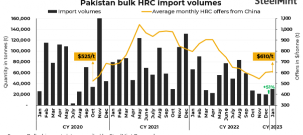 Pakistan’s bulk HRC import volumes increased by 51% m-o-m to 29,794 t in Jan’23. Import shipments had gradually slumped to mere 19,728 t in Dec’22 from the levels of 83,552 t in Aug’22. Demand in the country had remained slow amid political instability. Also, the currency had been depreciating against USD ($) since Oct’22. 1 PKR stood at $0.004512 in Oct’22. In Jan’23, it declined to $0.004278.