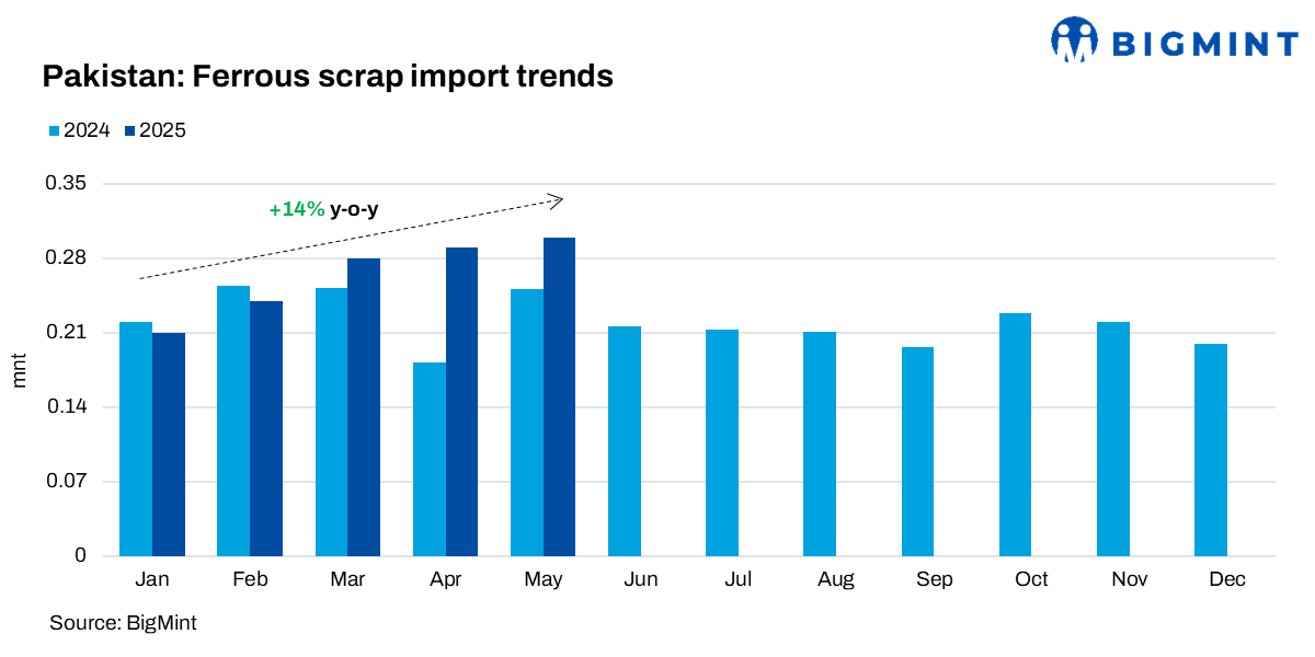 Pakistan’s ferrous scrap imports rose by 14% to 1.33 million tonnes (mnt) during the first five months of CY’25 (5MCY’25) compared to 1.17 mnt in the same period of CY’24.