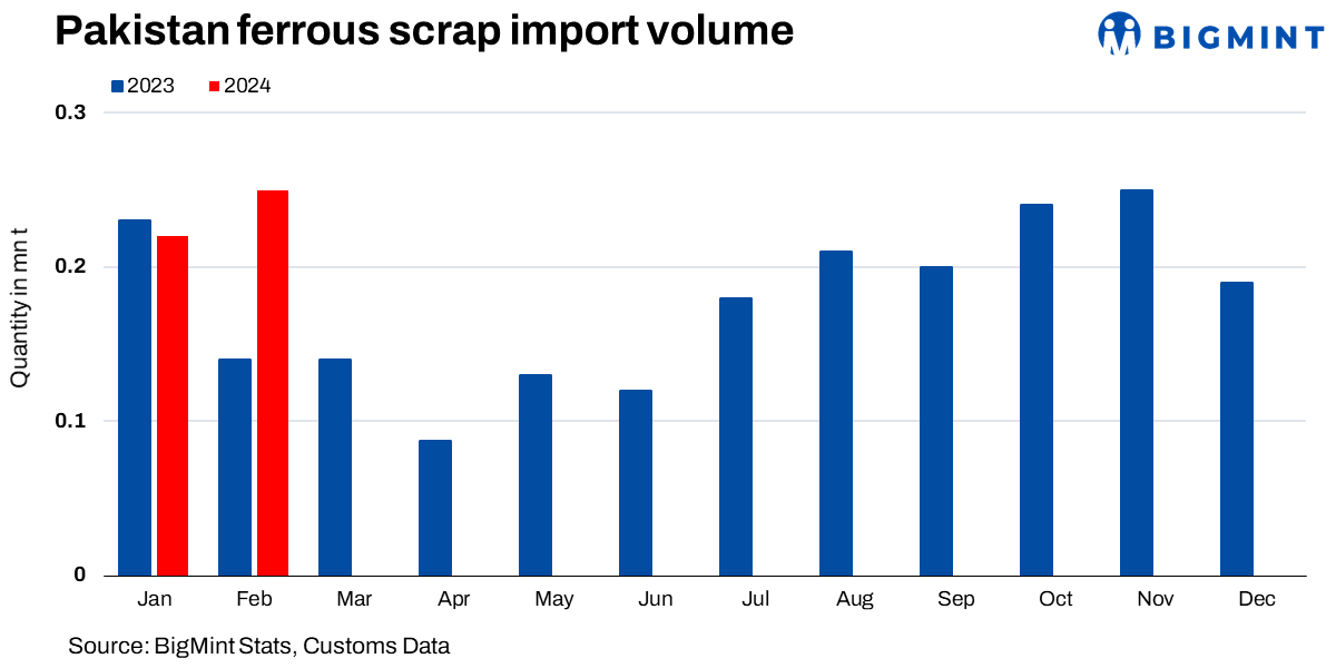 • In Feb’24, Pakistan imported 254,170 t of ferrous scrap, marking a 14% increase from Jan.