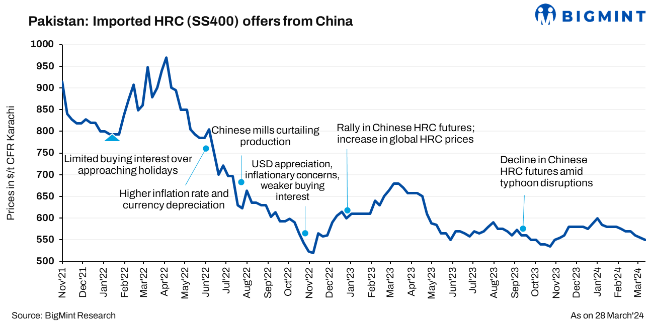 Chinese export offers for HRC (SS400) have dropped by around $5/t w-o-w to $540-545/t CFR Karachi, against $545-550/t last week. This decline in export offers from China is likely due to reduced demand during Holy Ramadan month, and downward movement of Chinese steel futures contracts.