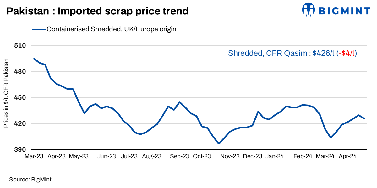 Imported ferrous scrap prices in Pakistan saw a $4/t decline from the previous week, reflecting a less supportive steel market. Despite expectations for a post-Ramadan and Eid rebound, the market is sluggish. Rebar prices have been informally reduced due to weak sales and mills focus on electricity bill payments.