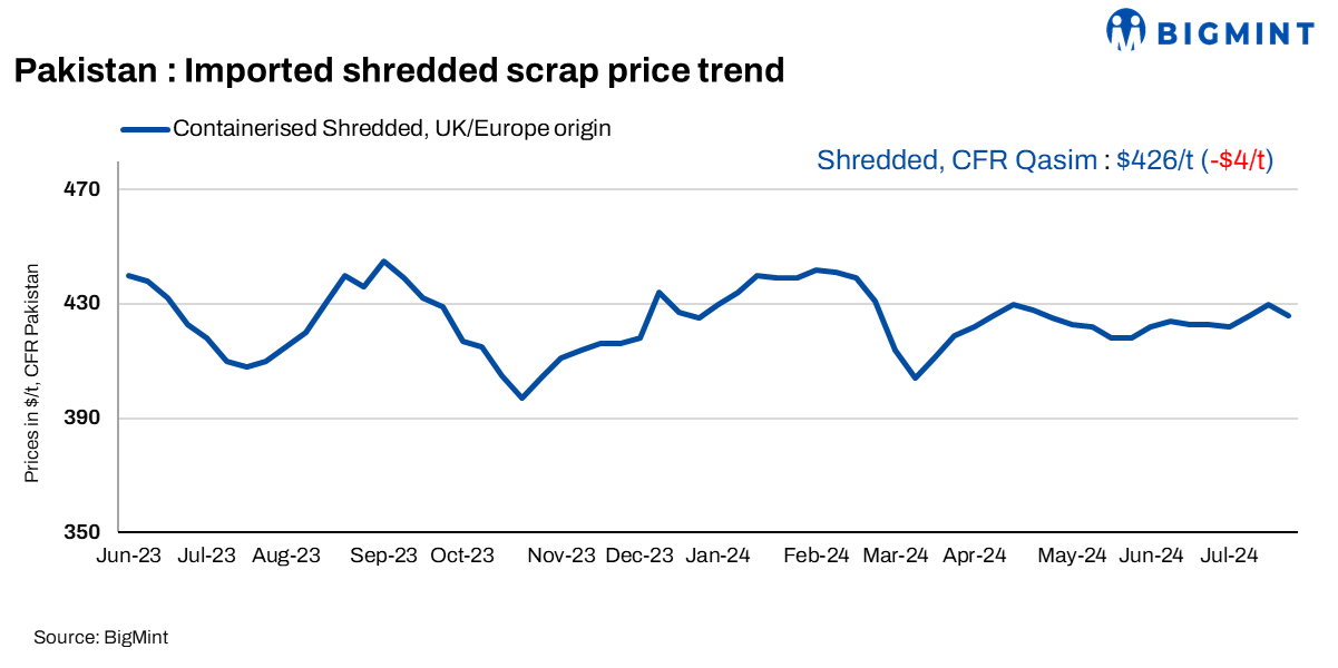 As per a major steel mill, buyers are cautious about procurement. The recent IMF approval may help the market recover from LC-related issues. The domestic market remained stable despite the high monsoon season. Prompt shipment materials are available at $430/t from the UK.