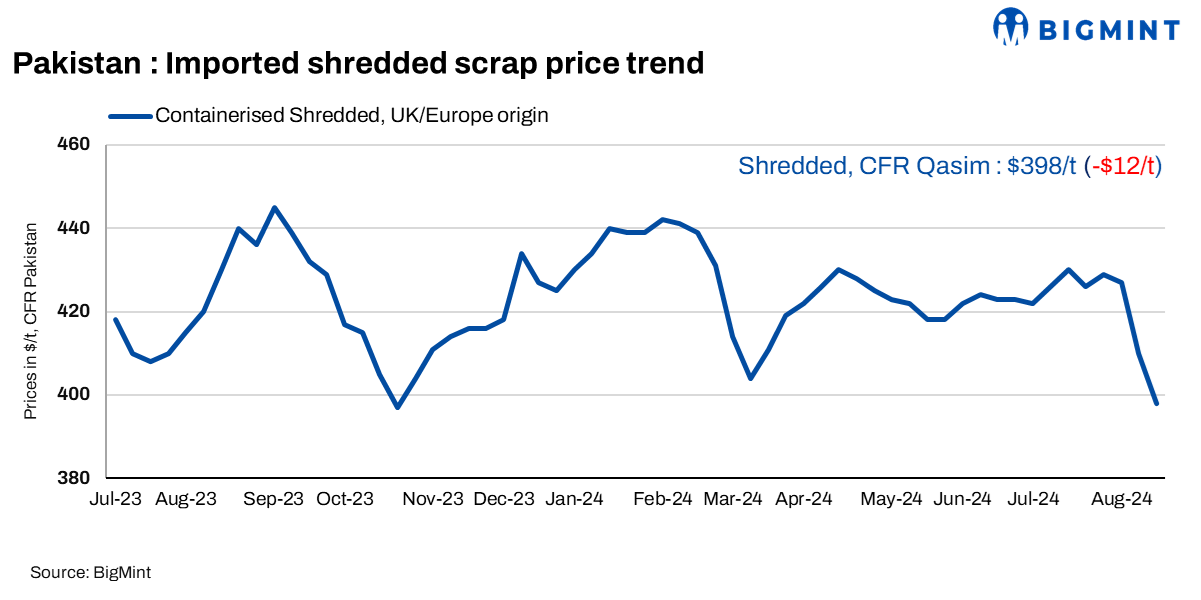 BigMint’s assessment of Europe-origin shredded scrap was at $398/t, down $12/t w-o-w.