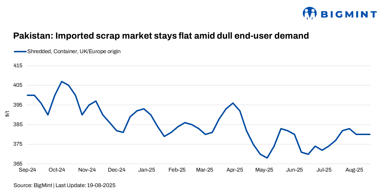 Imported ferrous scrap prices in Pakistan held steady w-o-w, with Europe/UK-origin material assessed at $380-382/t CFR.