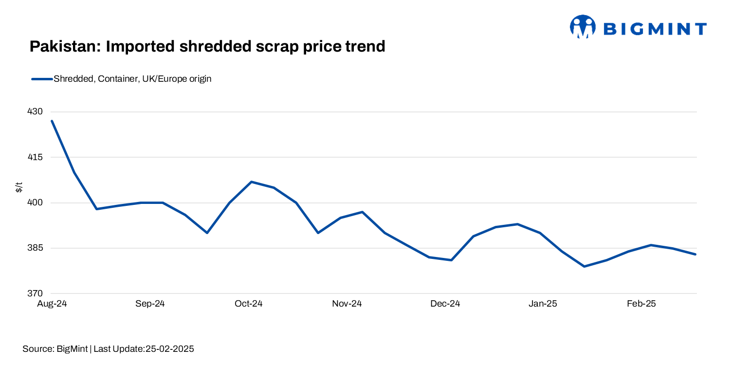 Pakistan’s demand for European scrap remained firm during the beginning of last week, which turned slow towards the weekend and by the start of this week. BigMint’s assessment for European/UK-origin shredded stood at $383/tonne (t) CFR Qasim, down by $2/t w-o-w.
