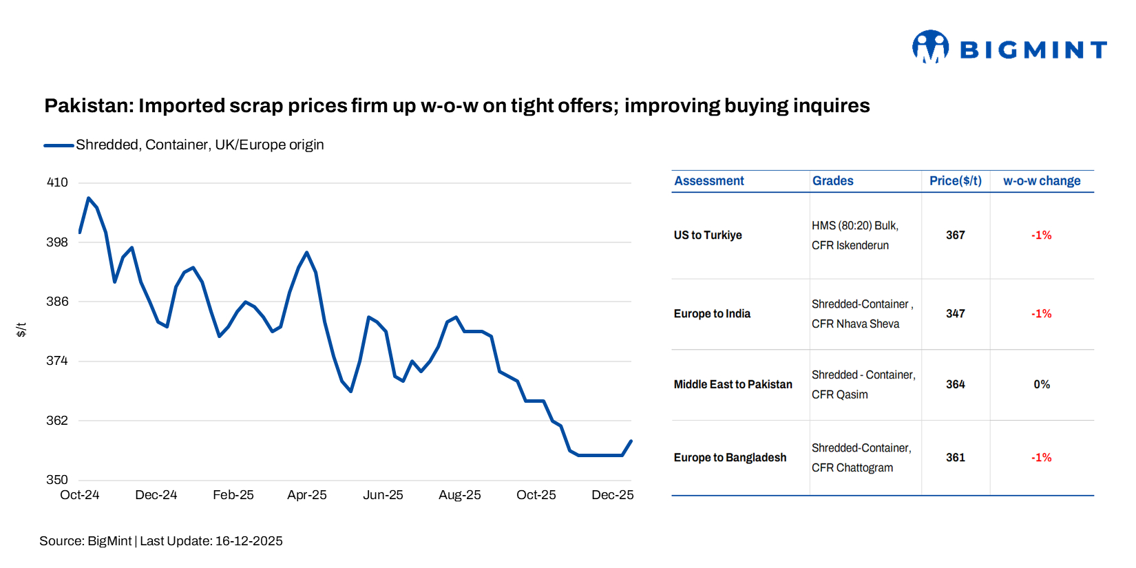 Pakistan’s imported shredded scrap price inched up by $3/t w-o-w at $358-360/t CFR for the week ended 16 December. Imported scrap market activity remained subdued, with overall sentiment quiet and momentum limited. However, offers edged higher amid fewer cargoes available in the market, prompting some buyers to turn slightly more active ahead of the holiday period.