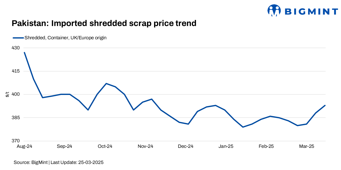 BigMint‘s assessment for European/UK-origin shredded scrap stood at $393/tonne (t) CFR Qasim, up by $5/t w-o-w.