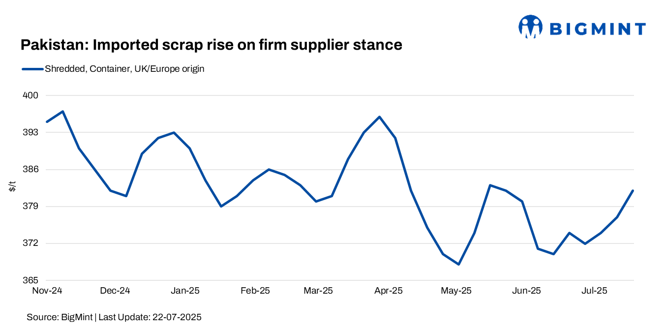 Imported scrap prices in Pakistan are expected to hover around $385-390/t CFR for EU and UAE-origin material in the near term. However, weak steel demand and ongoing monsoon disruptions may weigh on mill operations and limit buying momentum.
