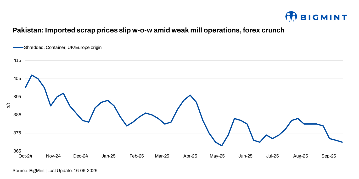 BigMint assessed European/UK-origin shredded at $370/tonne (t) CFR Qasim, inching down by $1/t w-o-w.