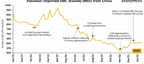Imported HRC market activity has slowed down in Pakistan amid LC opening issues. Chinese mills have held back offers for Pakistan amid LC issues and the upcoming Lunar New Year holidays. Fresh quotes from Japanese mills were heard at $700/t CFR Karachi for Mar’23 deliveries, up $50/t compared to previous week’s offers, sources informed.