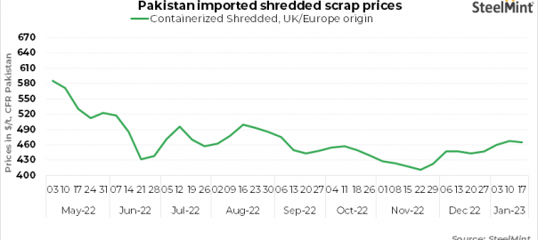 SteelMint’s assessment for shredded imported scrap in containers stands at $460/t CFR, slightly down $5/t w-o-w.