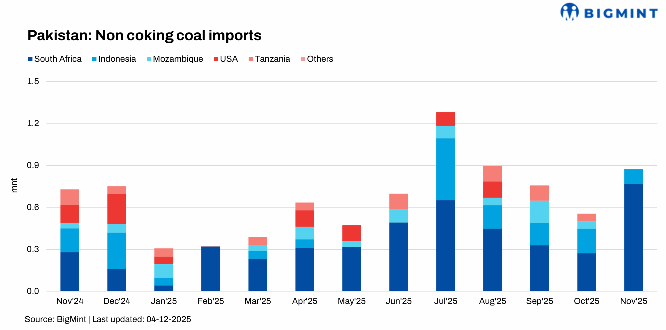 Pakistan’s non coking coal imports rose 57.5% m-o-m to 0.87 mnt in Nov from 0.55 mnt in Oct. Additionally, imports surged by 19.7% y-o-y from 0.73 mnt in Nov’24. South Africa remained the top supplier with 0.77 mnt, with volumes rising significantly by 181% m-o-m, followed by Indonesia with 0.11 mnt, reflecting a significant 39.3% m-o-m decline.