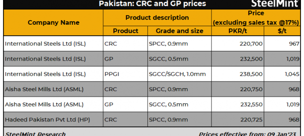 Major Pakistani steel mills – International Steel, Aisha Steel Mills and Hadeed Pakistan Pvt Ltd – have increased prices of cold-rolled coils (CRCs) and coated flat steel products by PKR 5,000/t ($22/t), effective 9 Jan’23. Appreciation of USD against PKR and an uptrend in global steel and raw material prices have pushed mills to raise prices in January, sources informed.