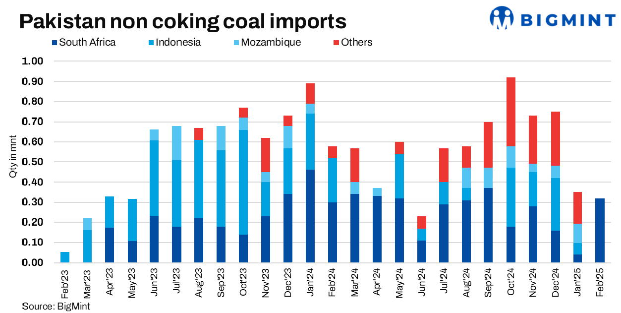 Pakistan’s thermal coal imports stood at 0.32 mnt in Feb’25, marking a 45% decline from 0.58 mnt in Feb’24 due to a shift to domestic coal usage, volatility in global prices, and fluctuation in exchange rates. However, imports remained relatively stable m-o-m, rising 3.2% from 0.31 mnt in Jan’25. South Africa was the sole supplier, accounting for the entire 0.32 mnt.