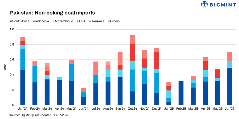Pakistan’s non-coking coal imports rose by 47.7% in Jun’25 to 0.70 mnt from 0.47 mnt in May’25. Despite this increase, cumulative imports for Jan-Jun’25 fell 13% to 2.82 mnt, compared to 3.23 mnt in the same period last year. Total imports in CY’24 were 7.5 mnt. South Africa remained the top supplier with 0.49 mnt in June, a 55% rise from May, followed by Tanzania with 0.11 mnt.