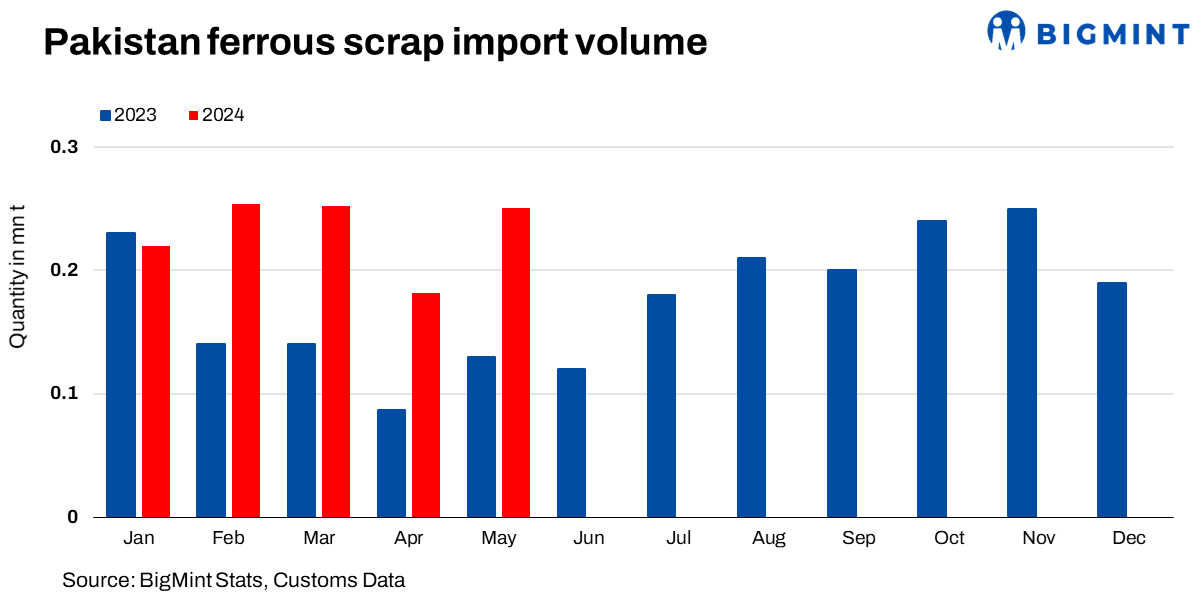 In May’24, Pakistan saw a significant increase of 37% in ferrous scrap imports at 250,734 tonnes (t), up from 182,675 t in Apr’24. Compared to May’23 (126,200 t) imports surged by 99% on a y-o-y basis. Meanwhile, over the first five months of CY’24, the total scrap imports surged by 62% y-o-y which is 1,163,090 t as compared to 717,700 t in Jan-May’23.