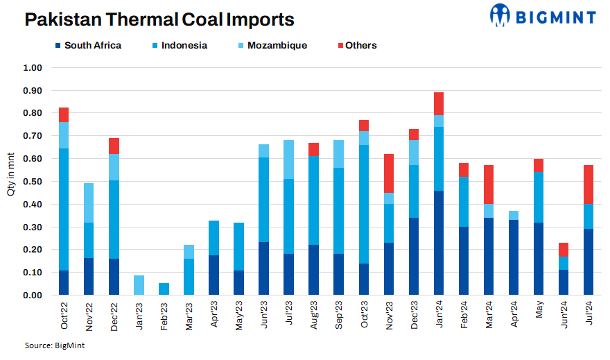 - Pakistan’s thermal coal import volumes rose significantly by 153% m-o-m to 0.58 mnt in Jul’24 compared to 0.23 mnt in Jun’24, as per customs data.