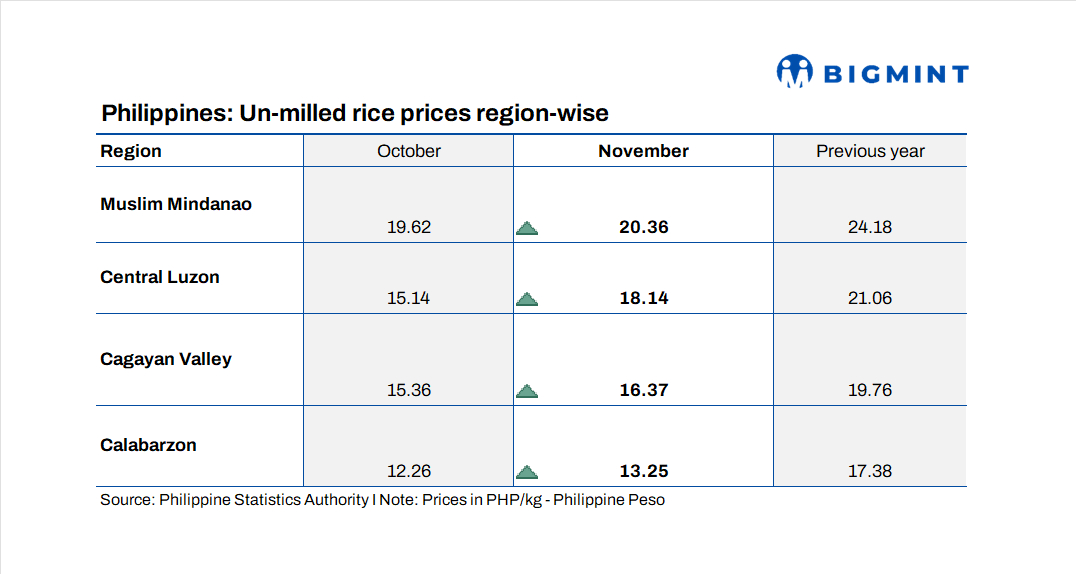 In Central Luzon, the country’s largest rice-producing region, palay prices rebounded to PHP 18.14 per kilogram in November from PHP 15.14 in October, though they remained significantly below the PHP 21.06 recorded in the same period last year. Cagayan Valley showed a similar pattern, with prices edging up month on month to PHP 16.37 per kilogram from PHP 15.36, but still trailing the year-ago level of PHP 19.76.