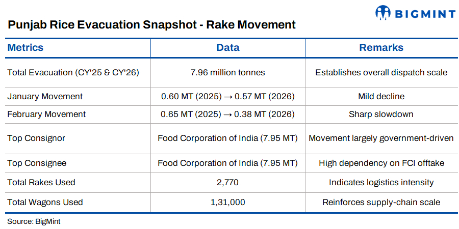 At the same time, rail evacuation data show uneven liquidation of stocks. Punjab has dispatched 7.96 million tonnes of rice by rail during the CY25 and CY26 period, reflecting substantial logistical activity. The state recorded 2,770 rakes, equivalent to nearly 131,000 wagons. However, monthly movement has slowed at a critical stage of the milling cycle. January dispatches stood at 0.57 million tonnes in 2026 compared with 0.60 million tonnes a year earlier. The decline widened in February, with volumes falling to 0.38 million tonnes from 0.65 million tonnes year-on-year, indicating that stock clearance is not keeping pace with milling output, as per data maintained by BigMint.