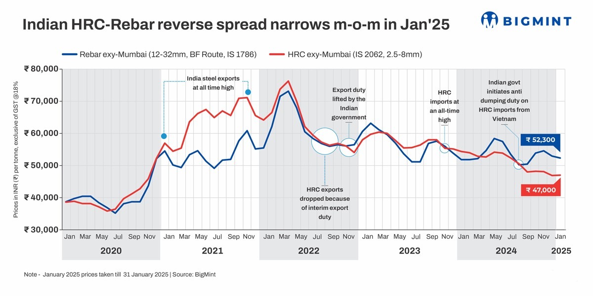 Morning Brief: The domestic hot-rolled coil (HRC)-rebar reverse spread continued to shrink in January 2025, settling at INR 5,300/tonne (t) ($61/t) against INR 6,000/t ($69/t) in December. The gap eased by INR 700/t ($8/t), as blast furnace (BF) rebar prices declined by 1.1% m-o-m to INR 52,300/t ($599/t), while HRC tags saw a minor 0.2% uptick to reach INR 47,000/t ($539/t).